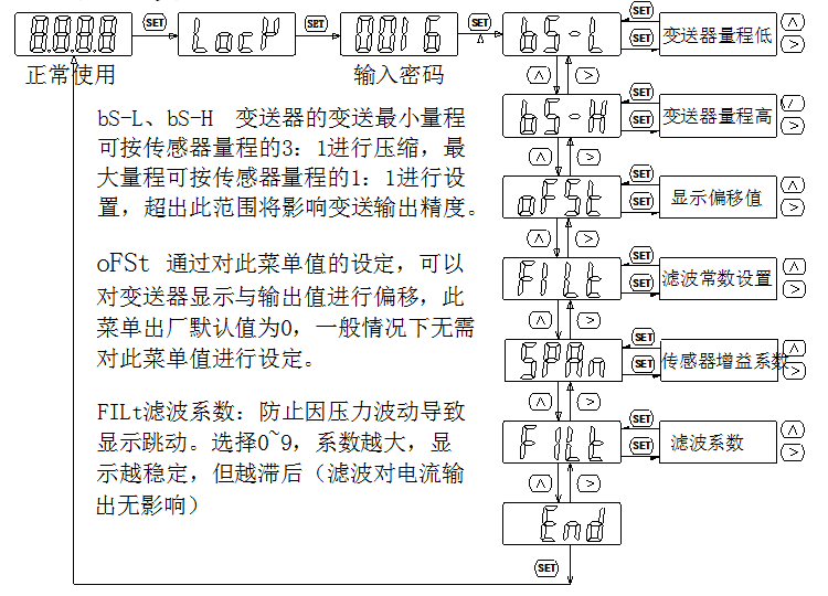 在變送器使用過(guò)程中,若傳感器的靈敏度發(fā)生改變時(shí),可通過(guò)此菜單對(duì)其修正,在進(jìn)行變送器的靈敏度修正前,若變送器零點(diǎn)有誤差,應(yīng)先通過(guò)主變量清零功能對(duì)變送器的零點(diǎn)誤差進(jìn)行修正,以保證靈敏度修正后變送的線性正常,此菜單默認(rèn)值為“1.0000”,此菜單也可用作液位變送器的密度修正,方便客戶在介質(zhì)密度發(fā)生變化是調(diào)整變送器輸出。